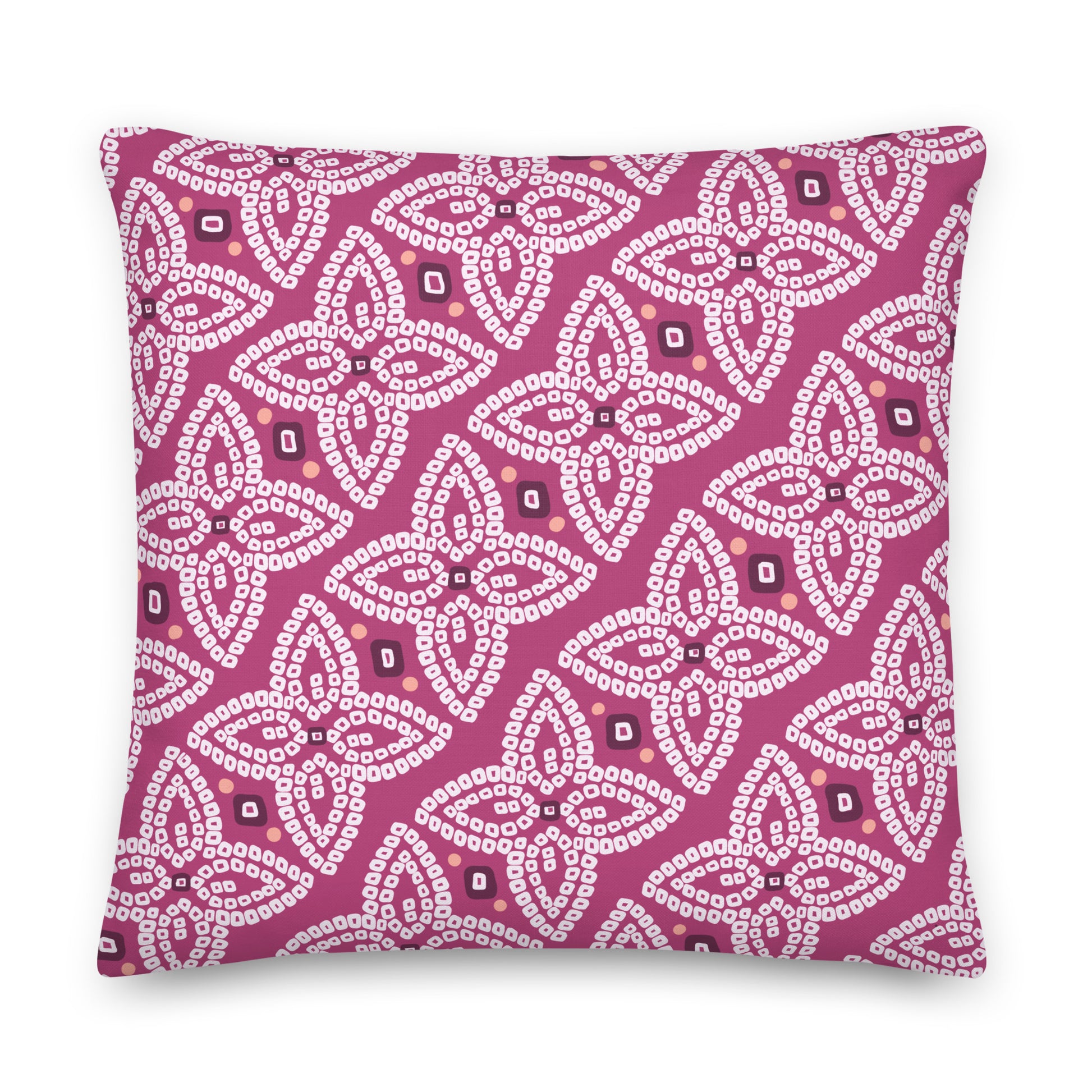 Inspired by Northern Indian prints and textiles, this bold premium feel pillow will add a pop of color to your space. This pillow is double-sided, with one side green and the other purple. Available in 3 sizes: 18x18, 22x22 and 20x12.